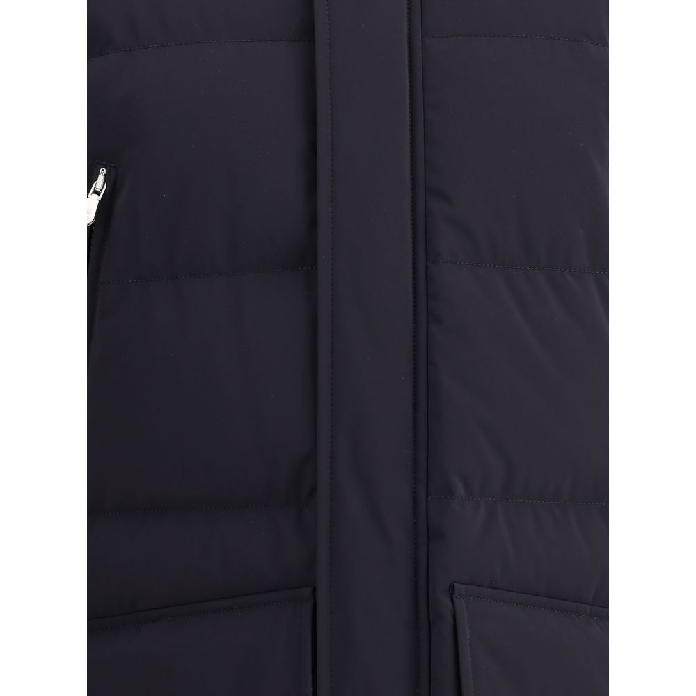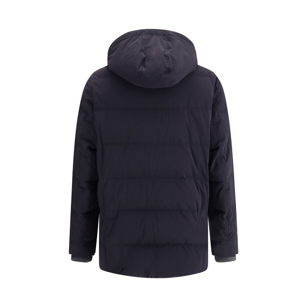 A Jaqueta de Penas Brunello Cucinelli combina elegância e funcionalidade em uma peça técnica e refinada. Com capuz removível e ajustável com cordão, possui gola alta para proteção ideal. O fechamento frontal combina um zíper duplo deslizante com uma aba com botão de pressão, garantindo segurança e estilo. O design inclui dois bolsos frontais com fenda e zíper, dois bolsos laterais com fenda e dois bolsos frontais com aba, oferecendo ampla praticidade. Punhos canelados garantem conforto e um ajuste perfeito, enquanto as duas fendas ajustáveis com botões nas costas aumentam a liberdade de movimentos. A peça é acolchoada e acolchoada, ideal para enfrentar os dias mais frios com um toque de classe e artesanato.