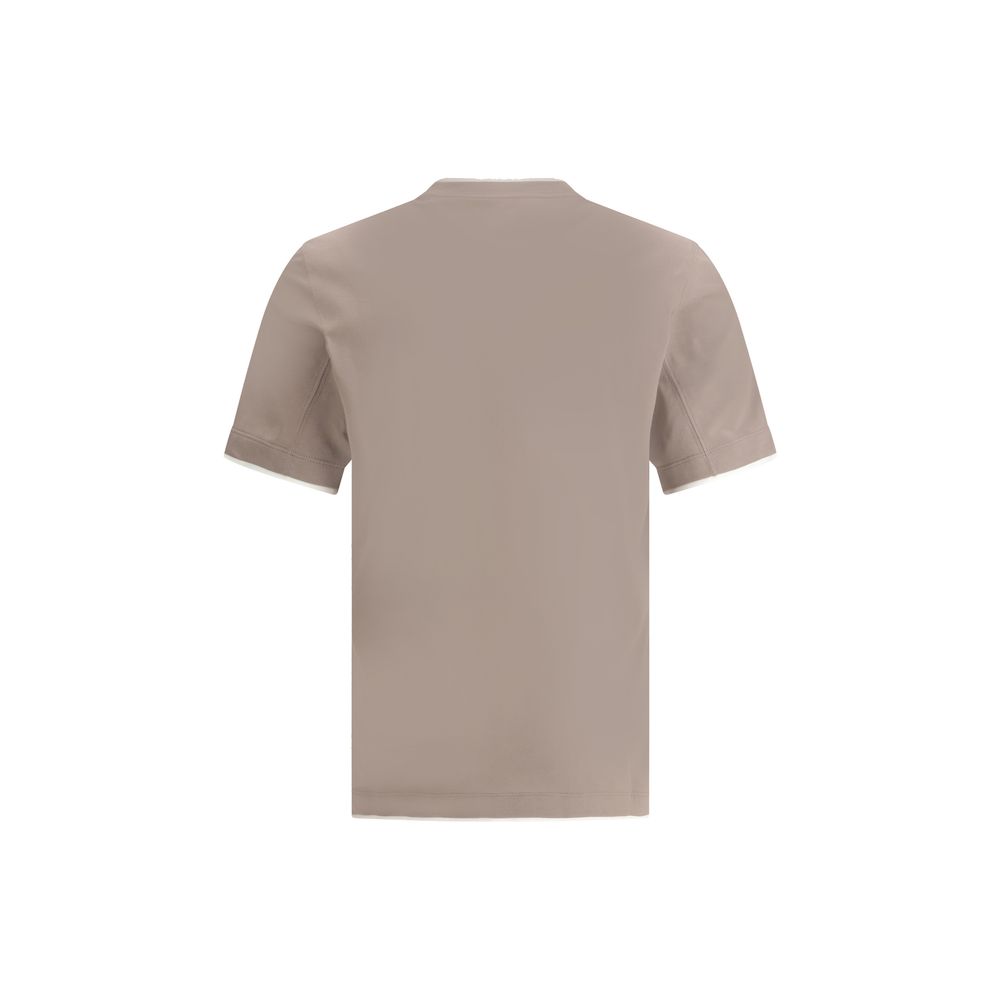 A camiseta de algodão Brunello Cucinelli apresenta um design refinado e versátil, com bainha dupla bicolor que adiciona um detalhe visual interessante. A estampa monocromática confere um visual clean e elegante, fácil de combinar com diversos looks. Com caimento regular, esta camiseta oferece conforto ideal, mantendo um visual sofisticado e contemporâneo.