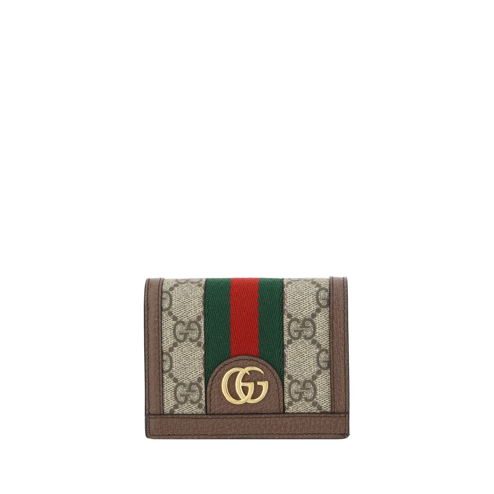 Carteira da Gucci, estampada em jacquard com o motivo GG Supreme, fecho de botão de pressão, placa com o logotipo GG na frente, detalhes em couro, compartimentos para cartões, compartimento para notas, bolso interno com zíper para moedas.
