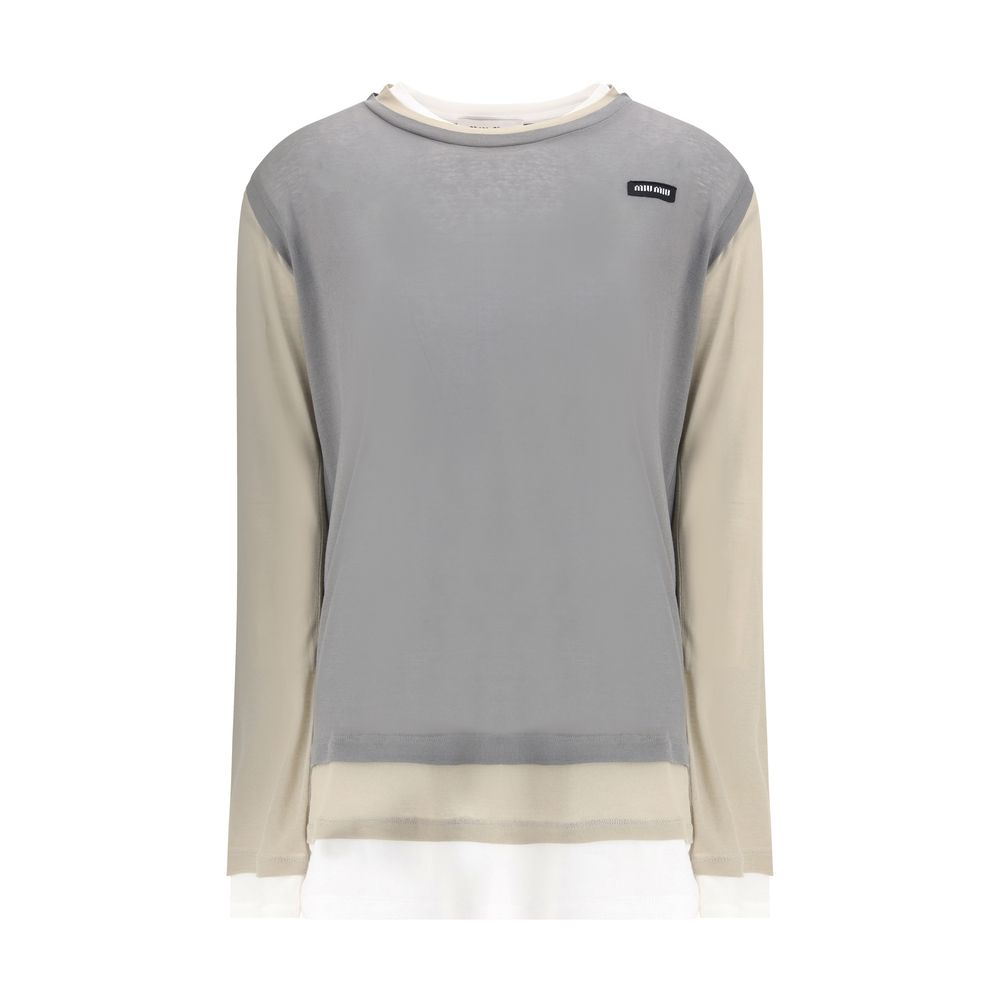 A camiseta de manga comprida da Miu Miu é uma peça essencial que combina conforto e estilo diferenciado. Confeccionada em algodão puro, oferece um toque macio e natural em contato com a pele. O design clássico de gola redonda é realçado por uma aplicação do logotipo no peito, um detalhe refinado que atesta sua autenticidade. O vivo em camadas adiciona um toque de originalidade e dinamismo à silhueta, tornando-a perfeita para completar looks casuais com uma elegância discreta e moderna.