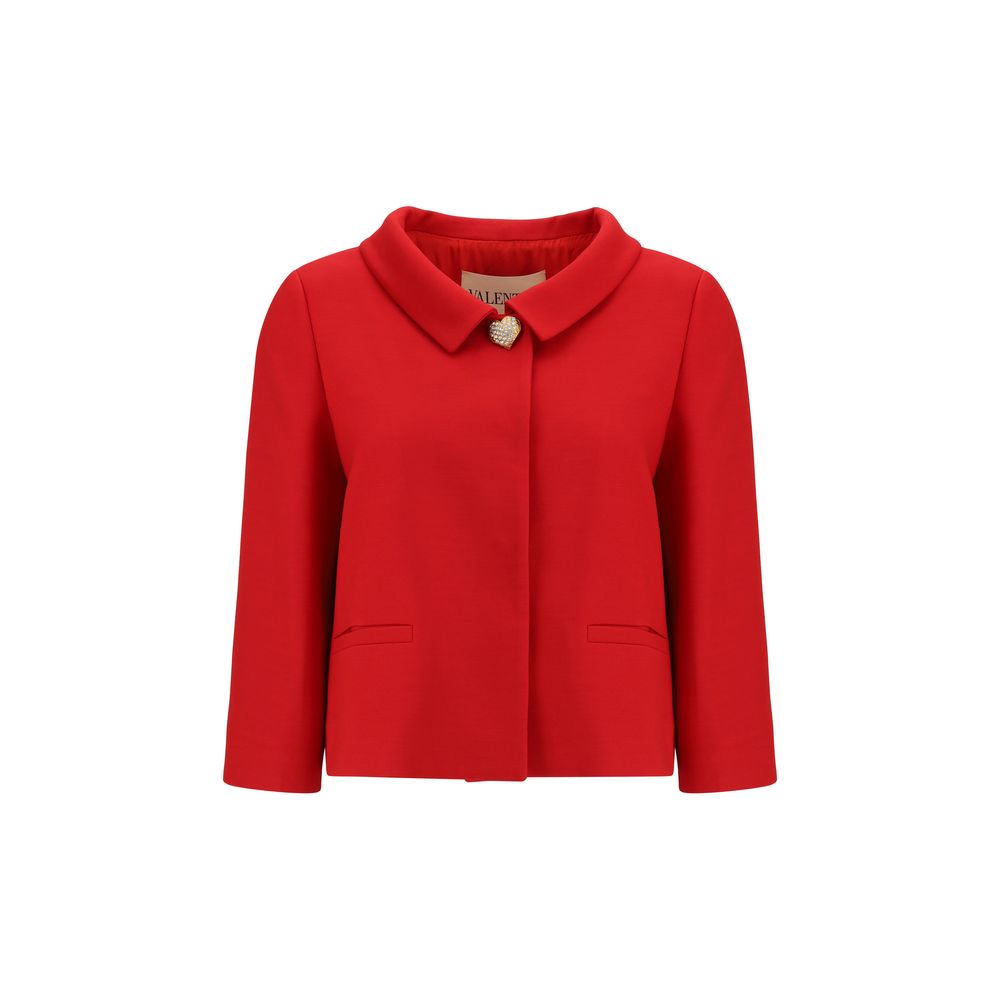 Valentino’s Blazer is a sophisticated and sophisticated piece, perfect for adding elegance to any look. The classic collar and front snap-button closure give it a clean, formal cut. The two front welt pockets add a touch of functionality, while the heart-shaped button with rhinestones on the front gives a distinctive and shiny detail, making the blazer unique and irresistible.
